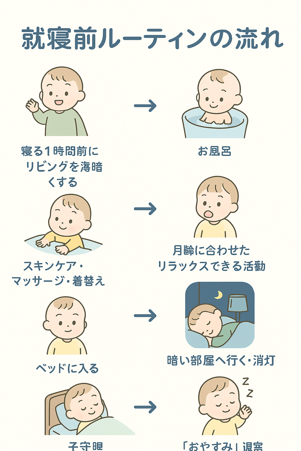 いつも同じパターンを繰り返すことで、赤ちゃんは「そろそろ寝る時間だ」と安心し、心の準備を整えることができます。